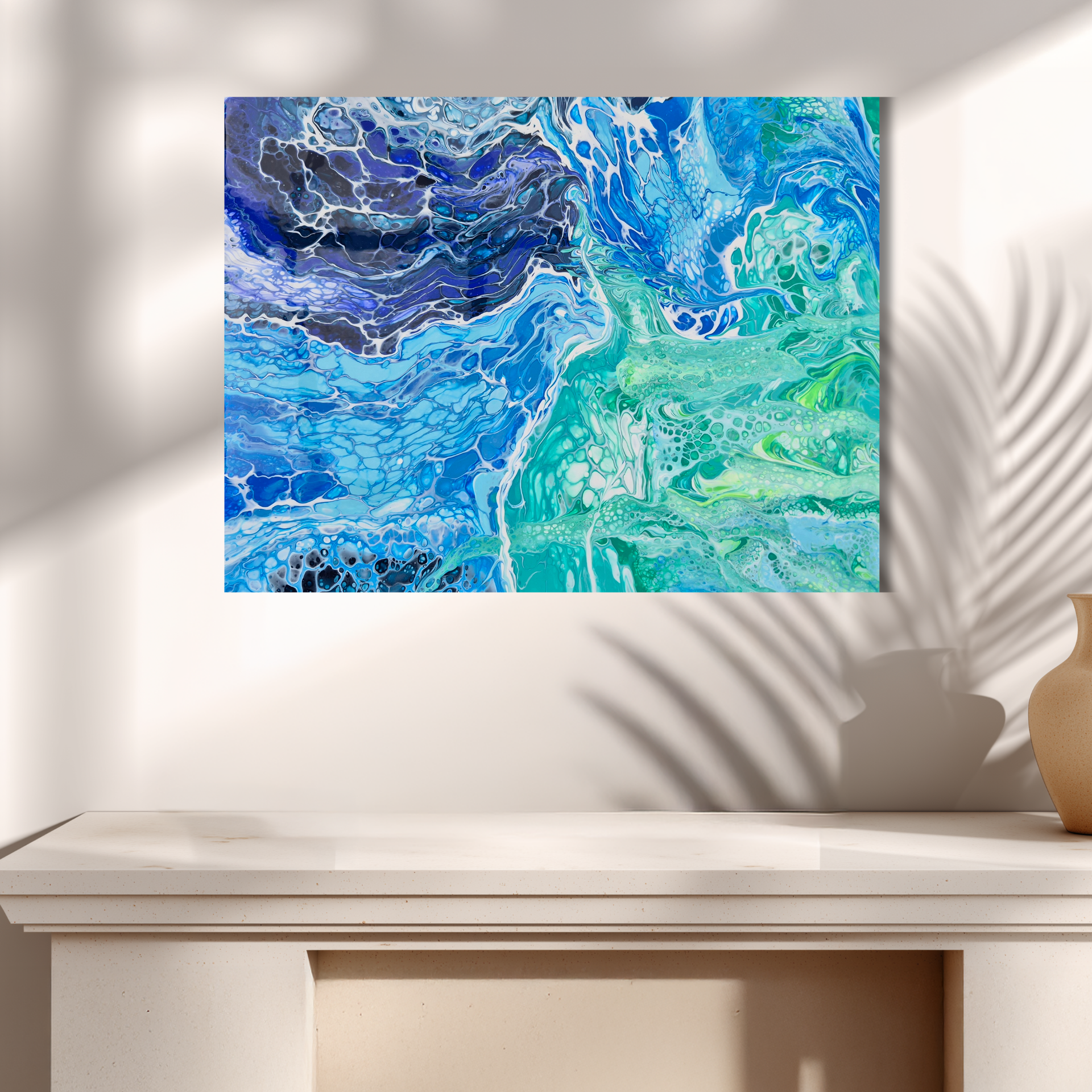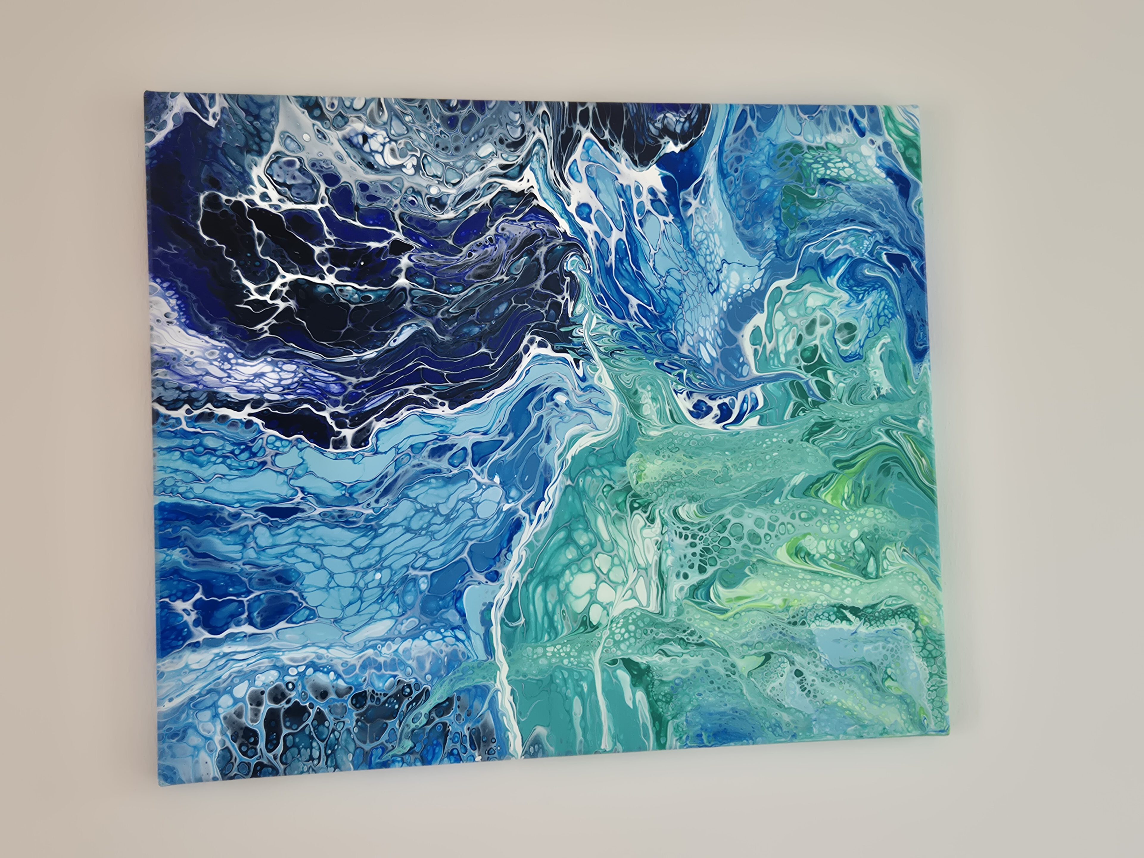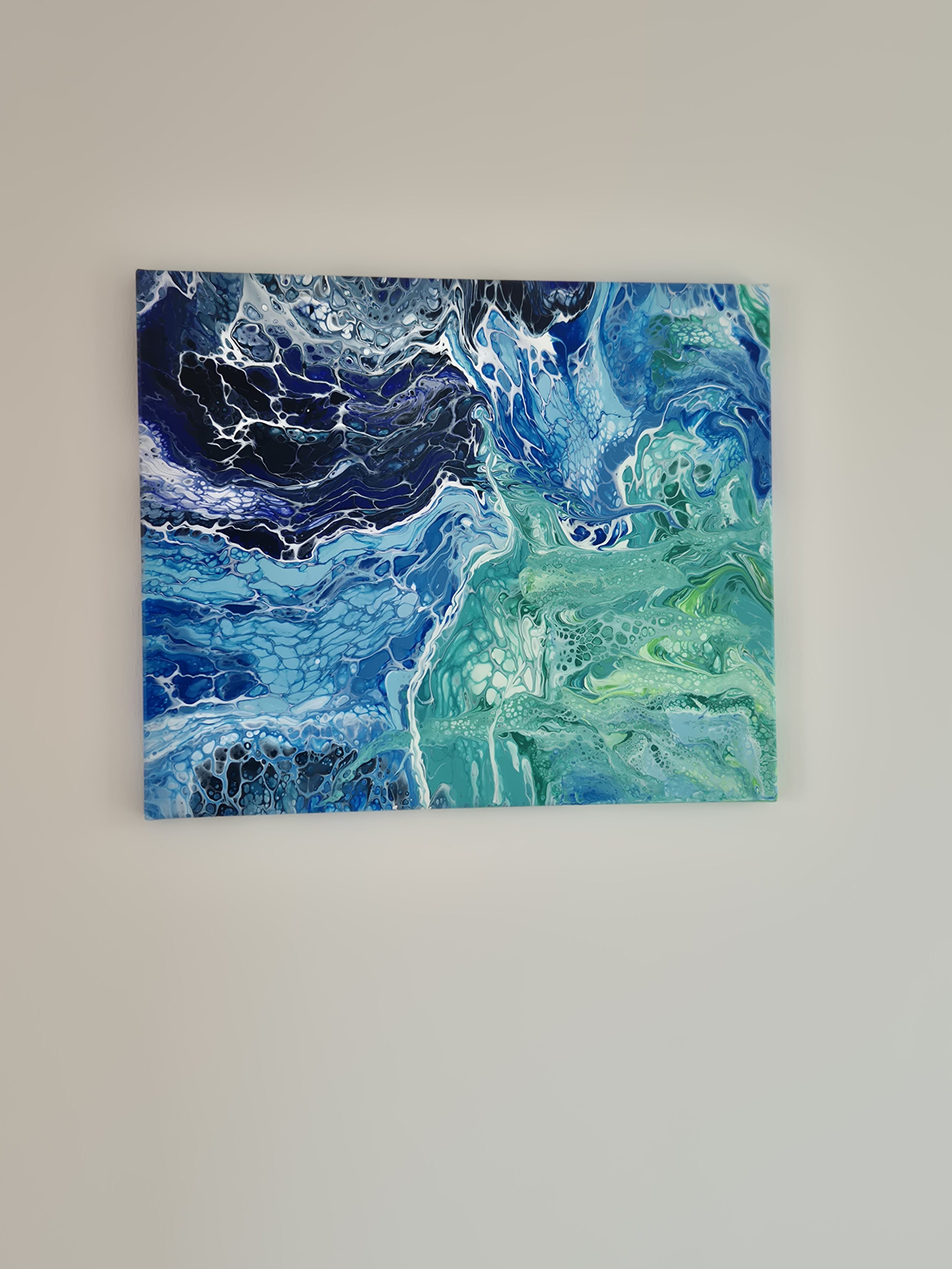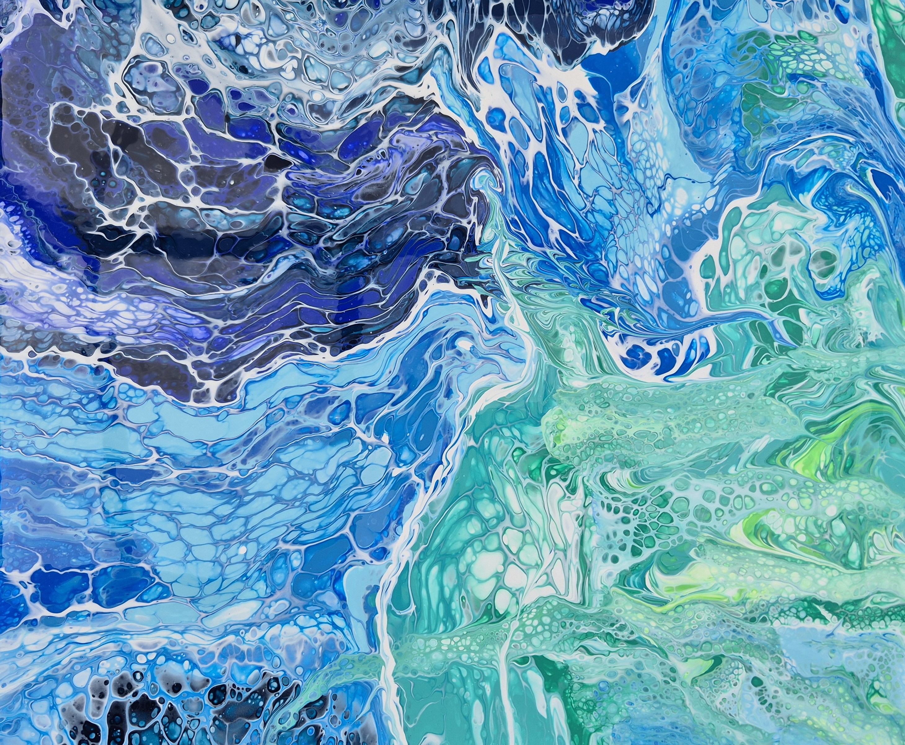 Aus dieser farbenfrohen Kombination verschiedener Grün- und Blautöne schauen einen direkt zwei Raben an – einer in hellblau, der fröhlich etwas erzählt. Über ihm ist ein weiterer Rabe in dunkelblauem Gefieder, der in die gleiche Richtung schaut, aber still beobachtet.