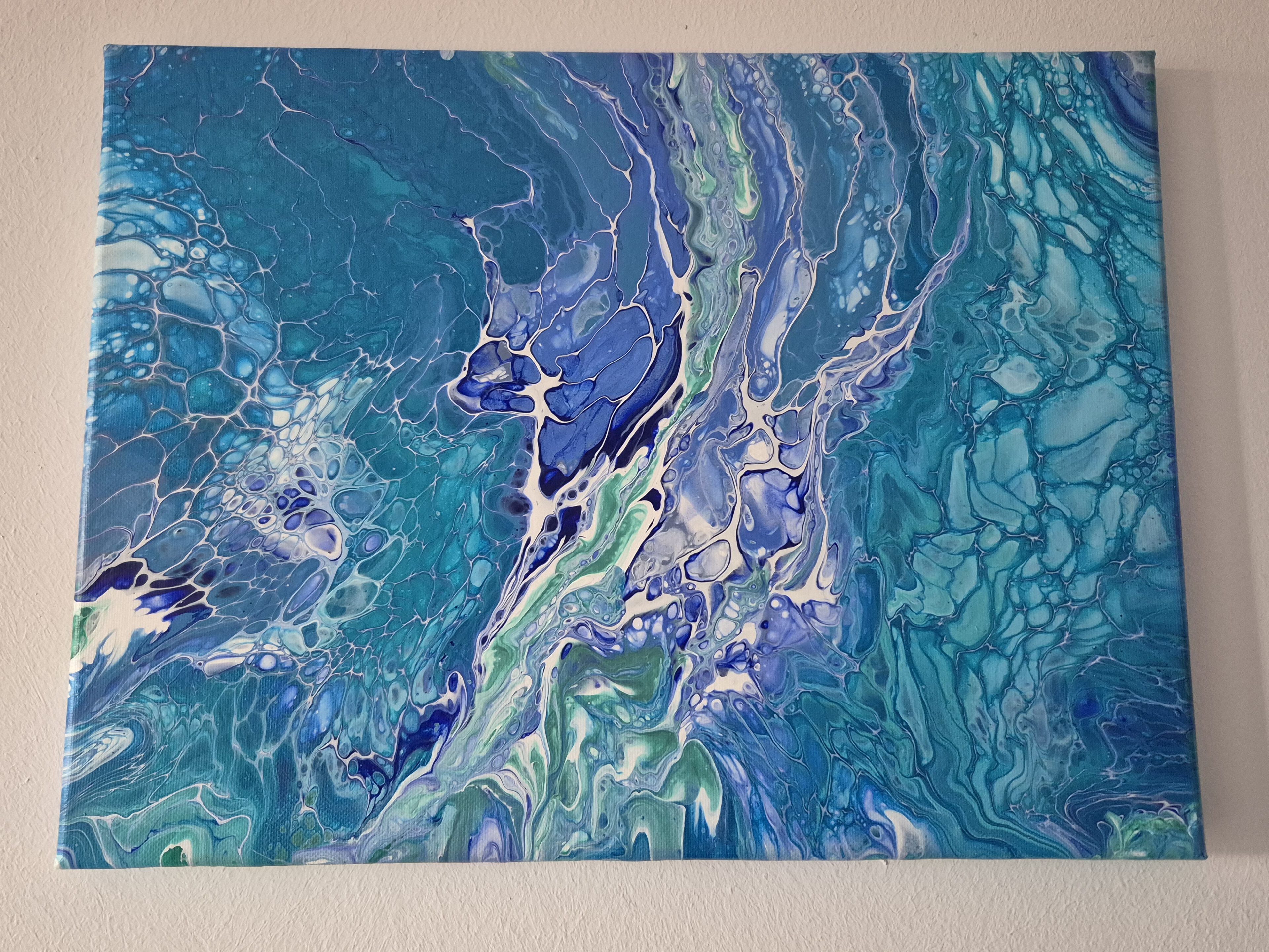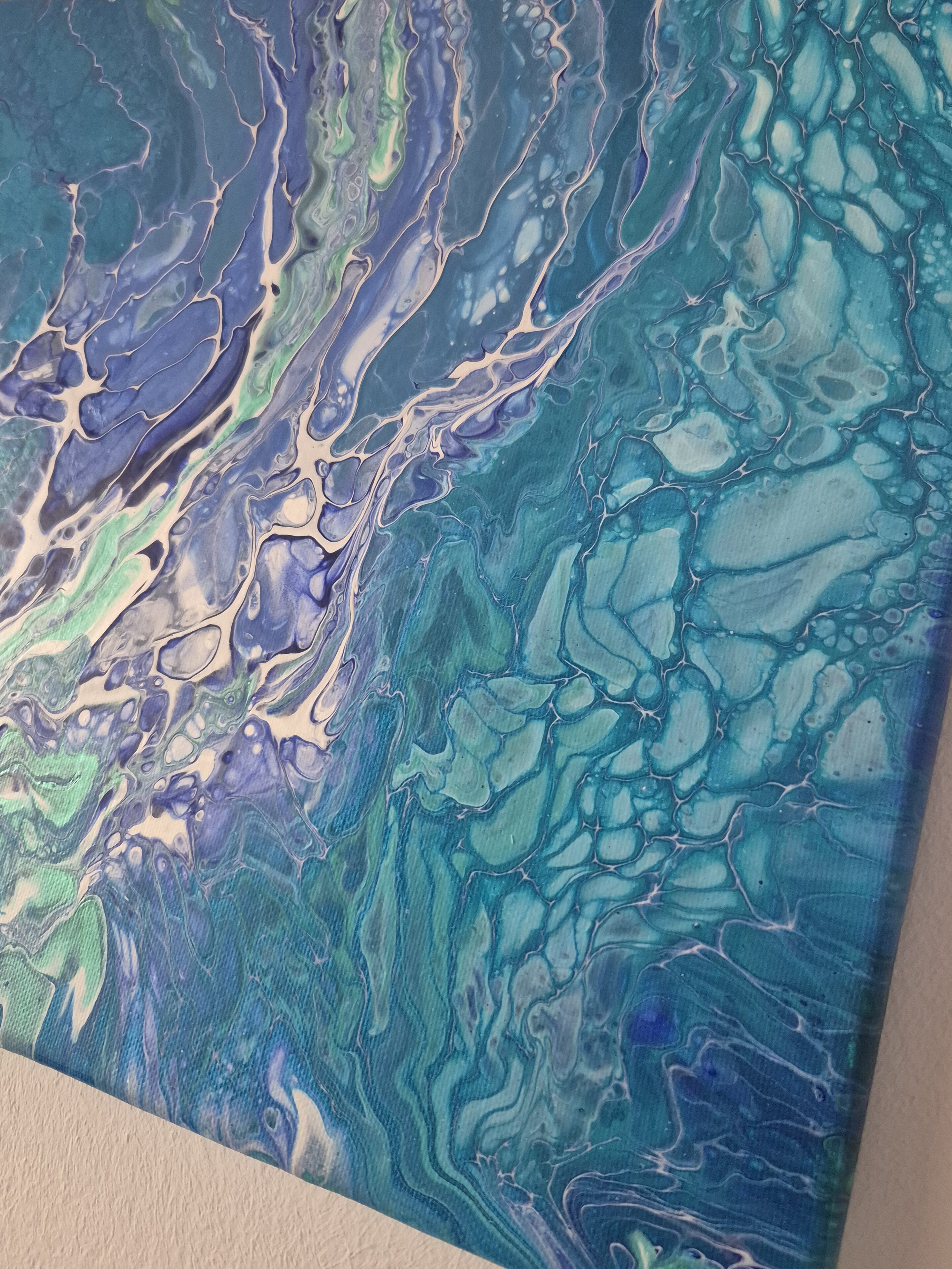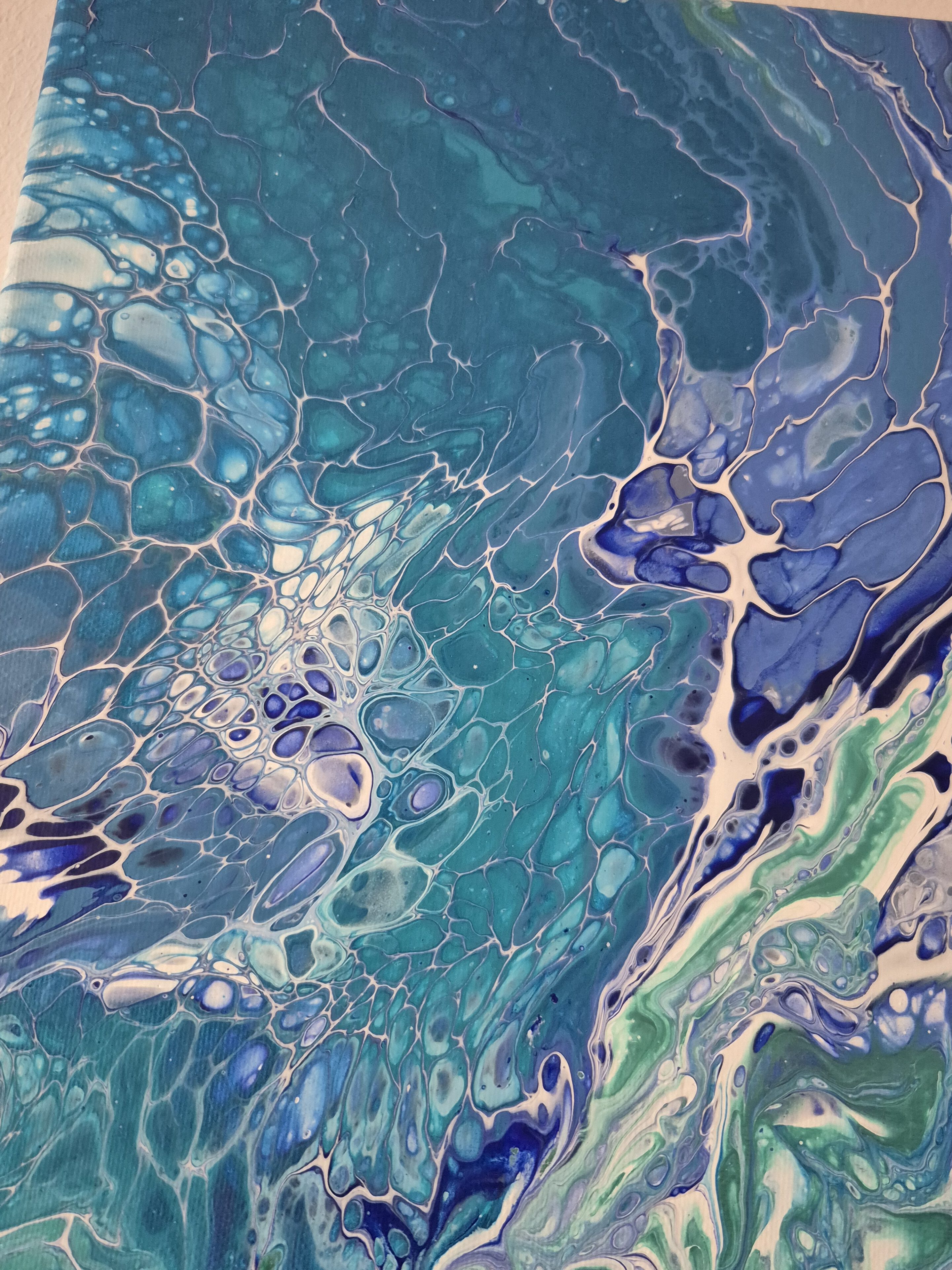 In Türkis-Blau- und Grüntönen sieht man eine Unterwasserwelt mit Strömungen. Ist das gar ein Krake mit seinen Tentakeln? Oder doch eine Frau mit längeren Haaren, die wir im Profil sehen?