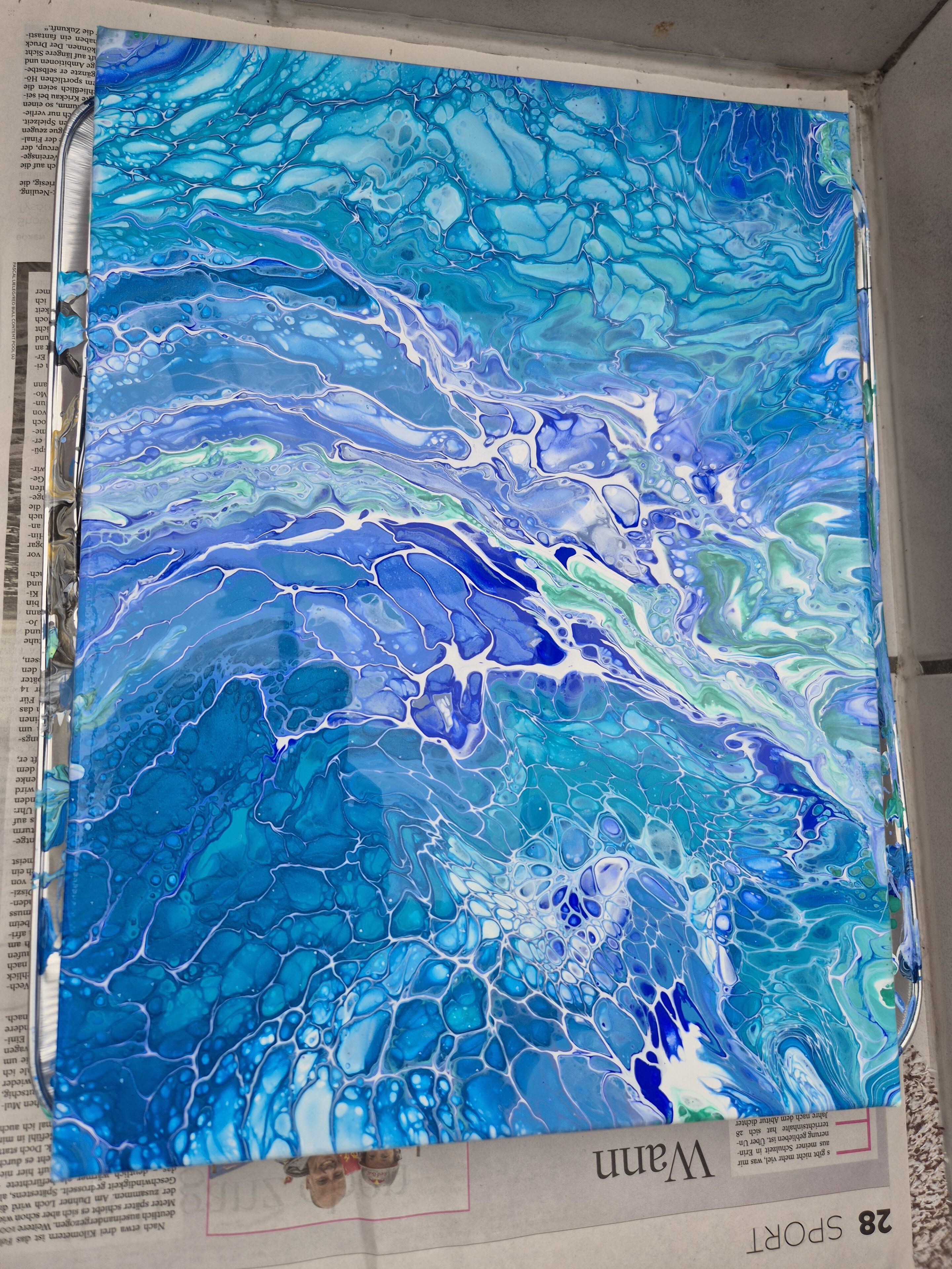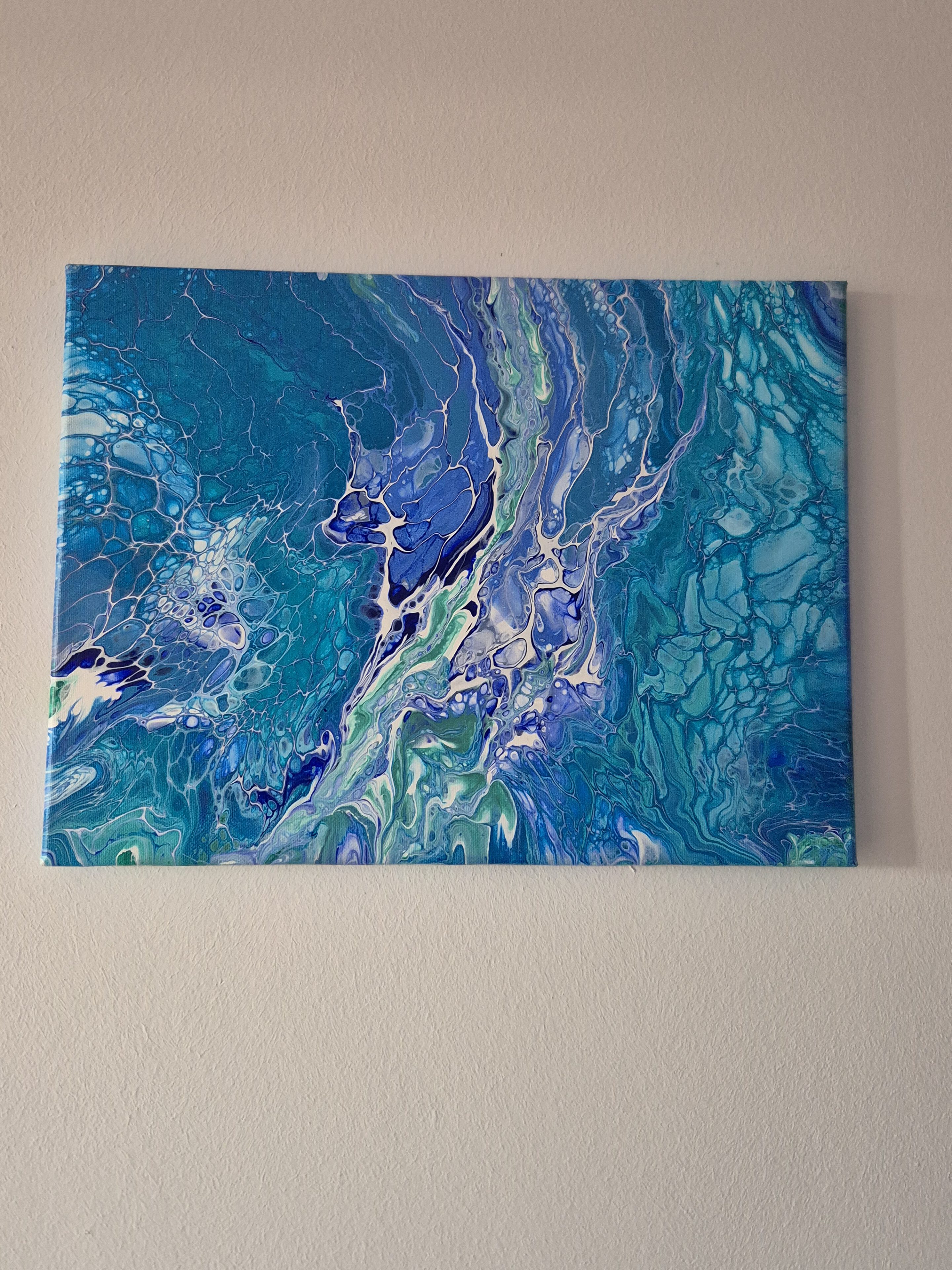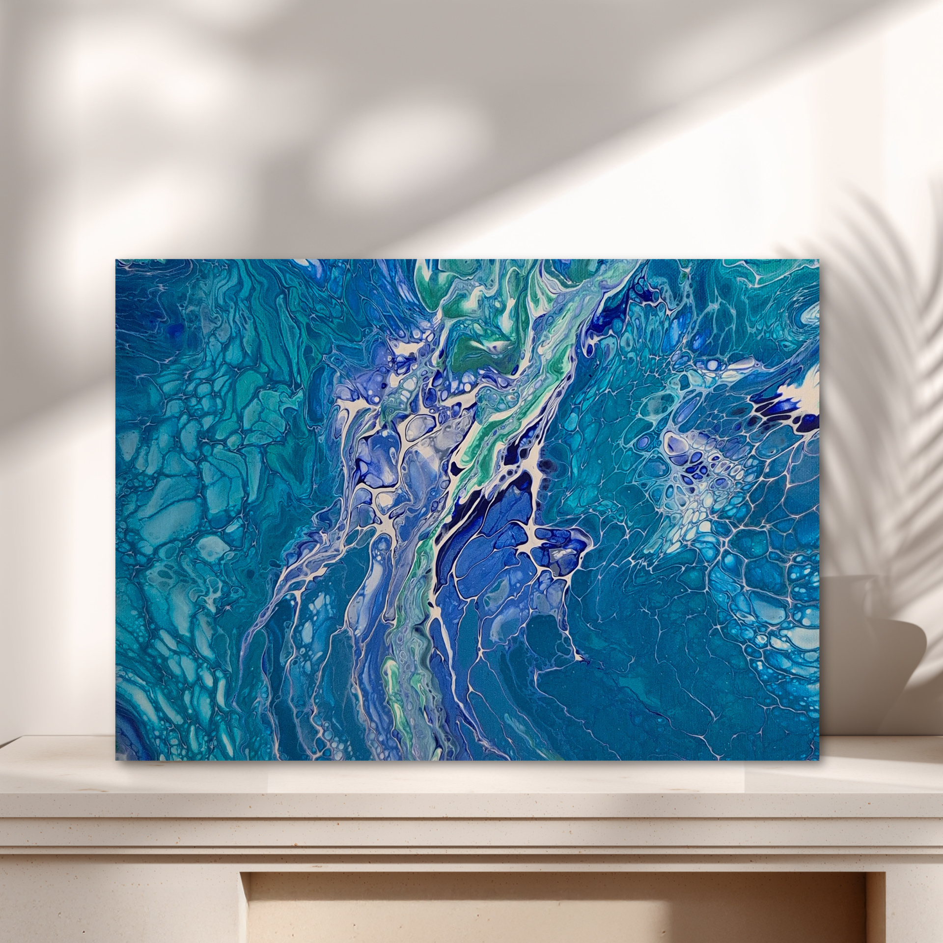 In Türkis-Blau- und Grüntönen sieht man eine Unterwasserwelt mit Strömungen. Ist das gar ein Krake mit seinen Tentakeln? Oder doch eine Frau mit längeren Haaren, die wir im Profil sehen?