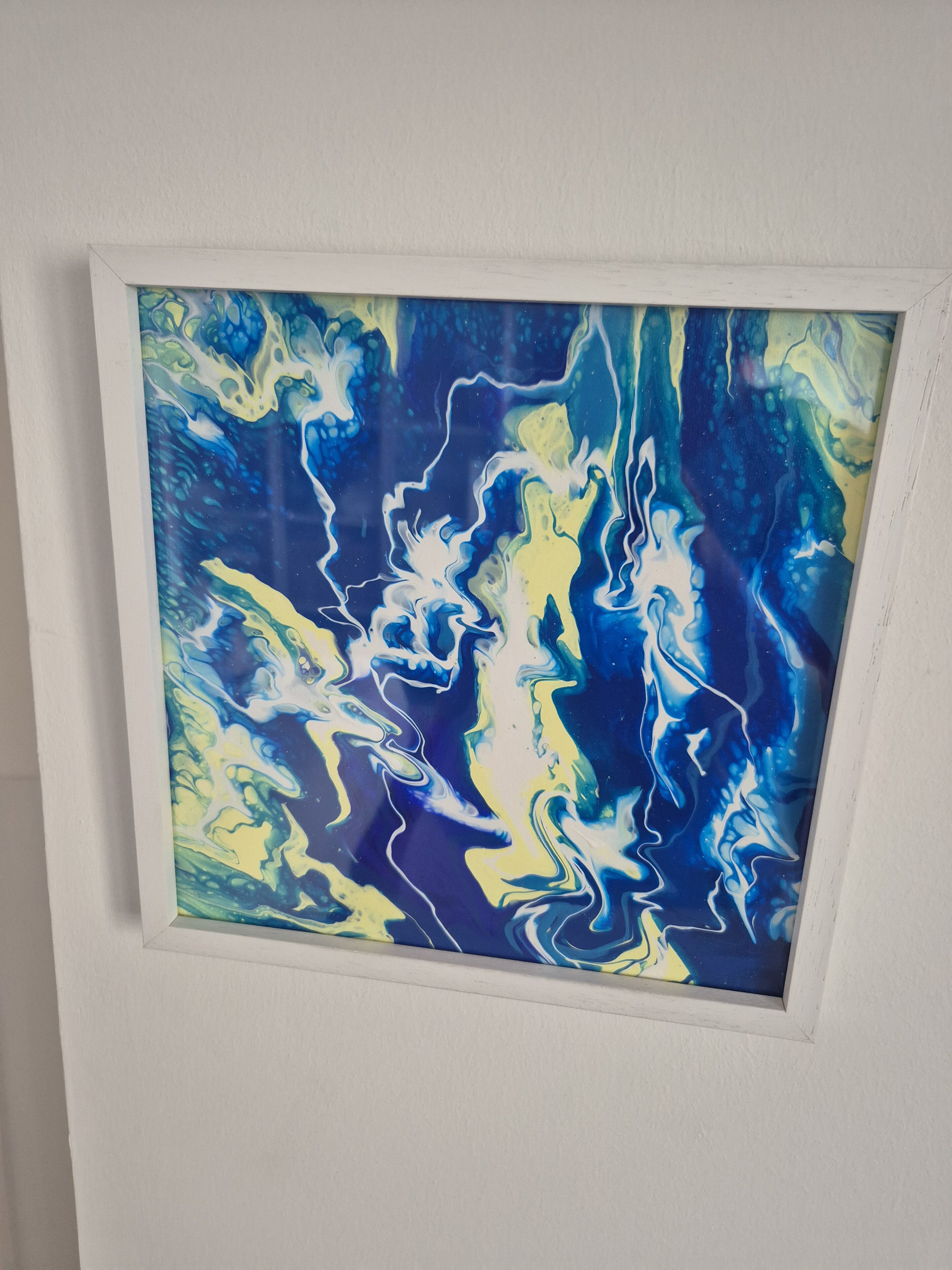 Original abstraktes Acrylbild „Gelb-blaues Potpourri“ – Fluid Art auf Leinwand (25 x 25 cm)