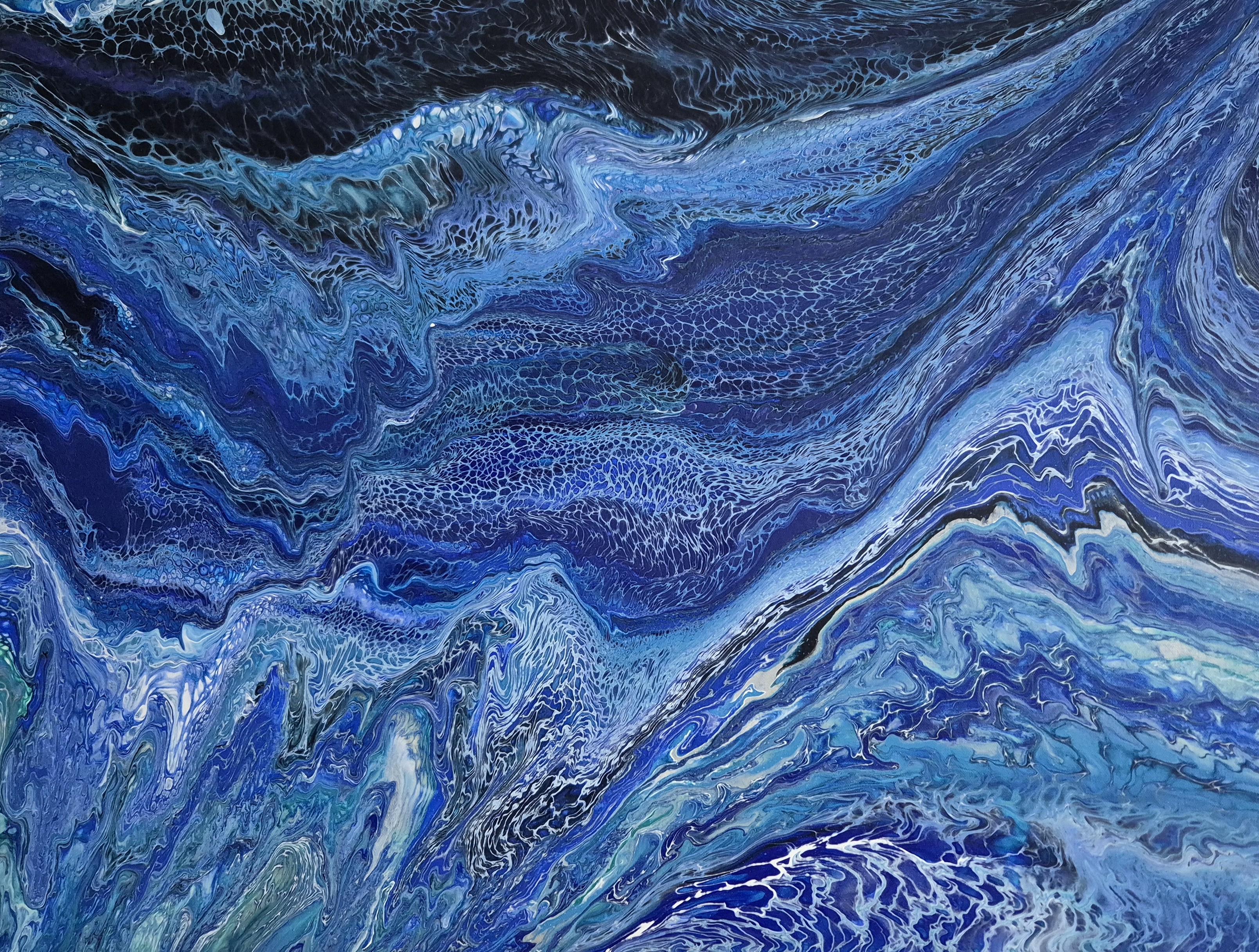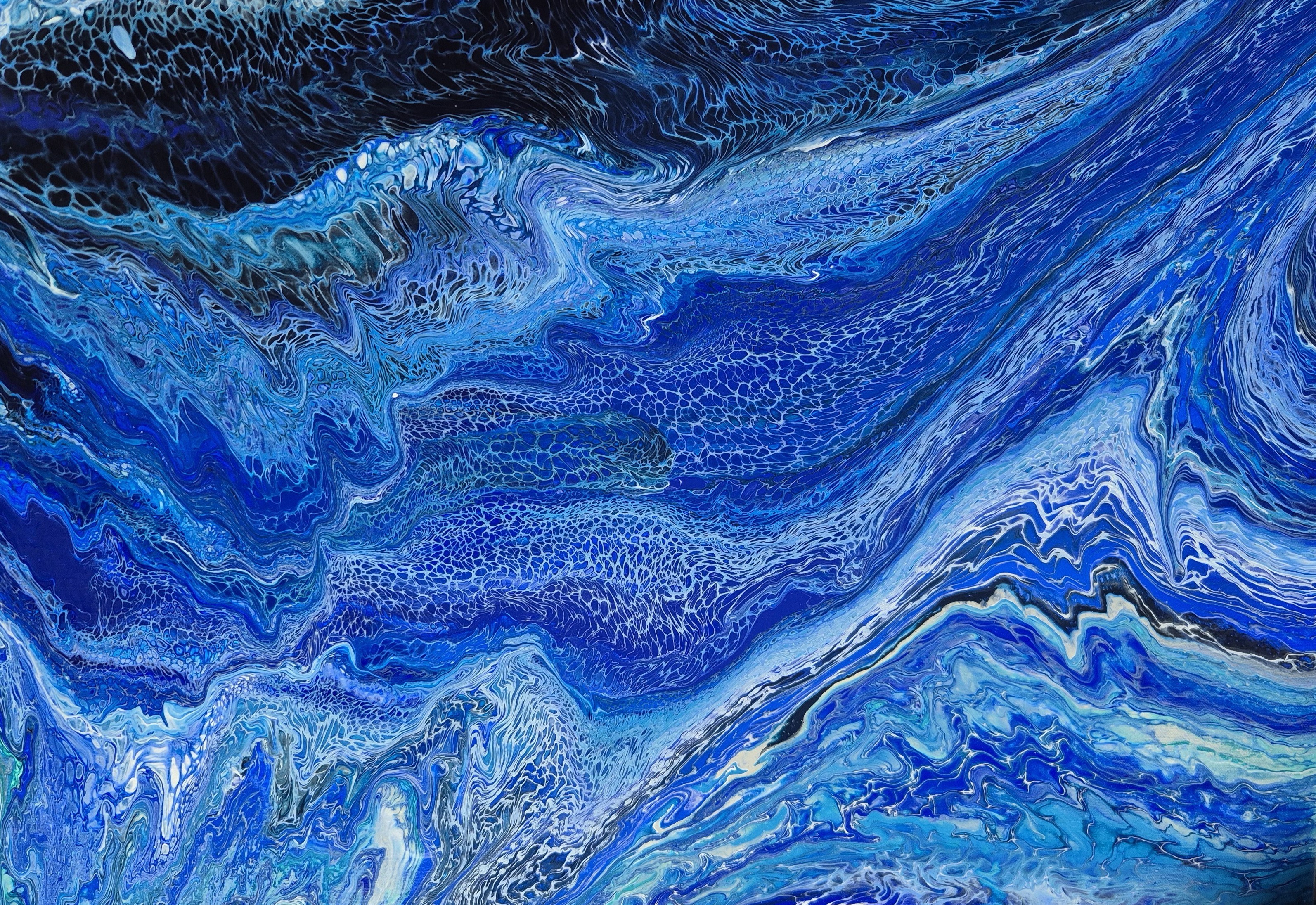 Das Motiv ist eine Hommage an die Strömungen und die verschiedenen Farben des Meeres. Die Farbpalette ist dominiert von tiefen Blau- und Türkistönen, durchzogen von leuchtendem Weiß, das Luftblasen und die Gischt des Wassers darstellt. Es ist ein abstraktes Kunstwerk, das die Vielfalt und Bewegung des Ozeans ausstrahlt.