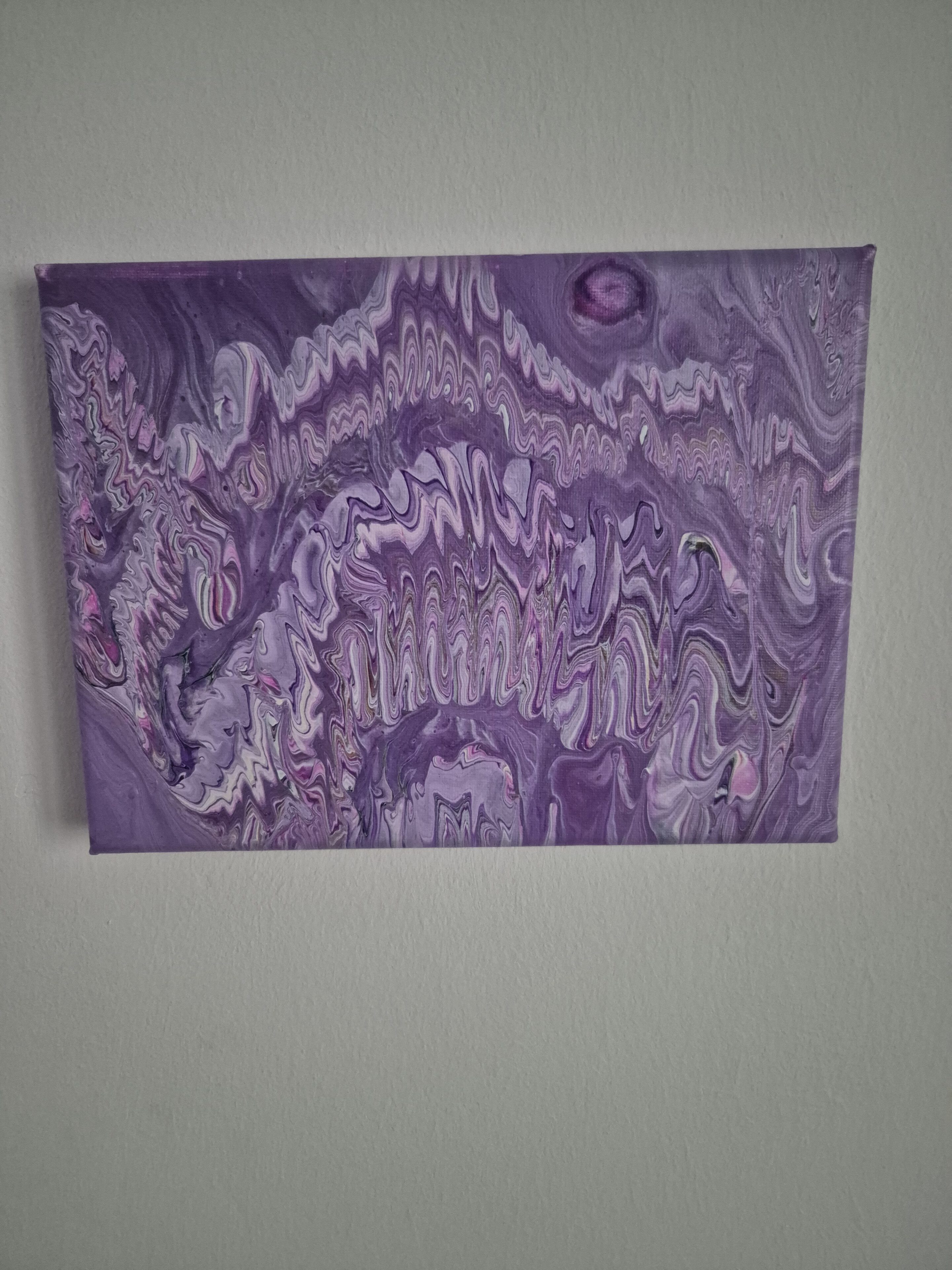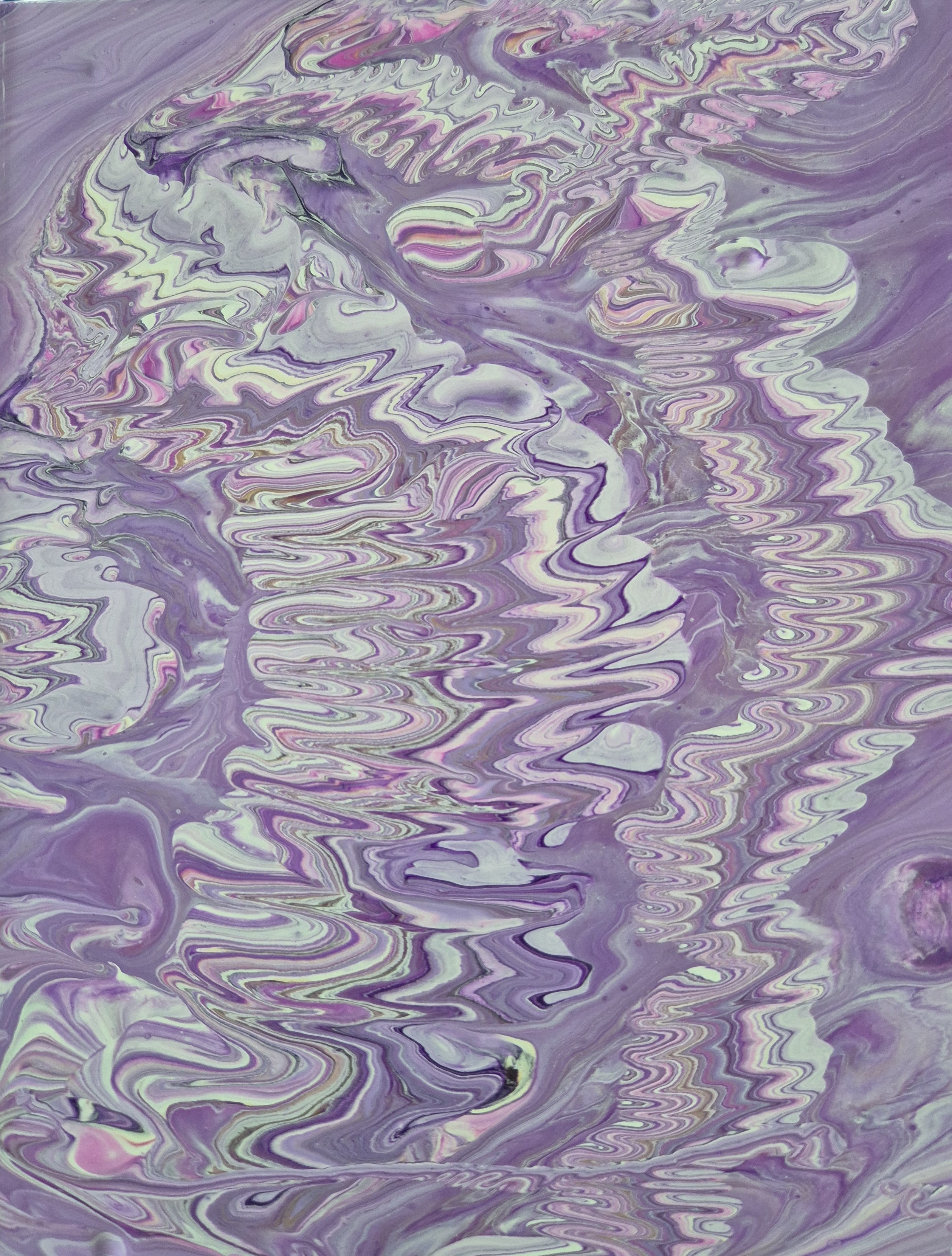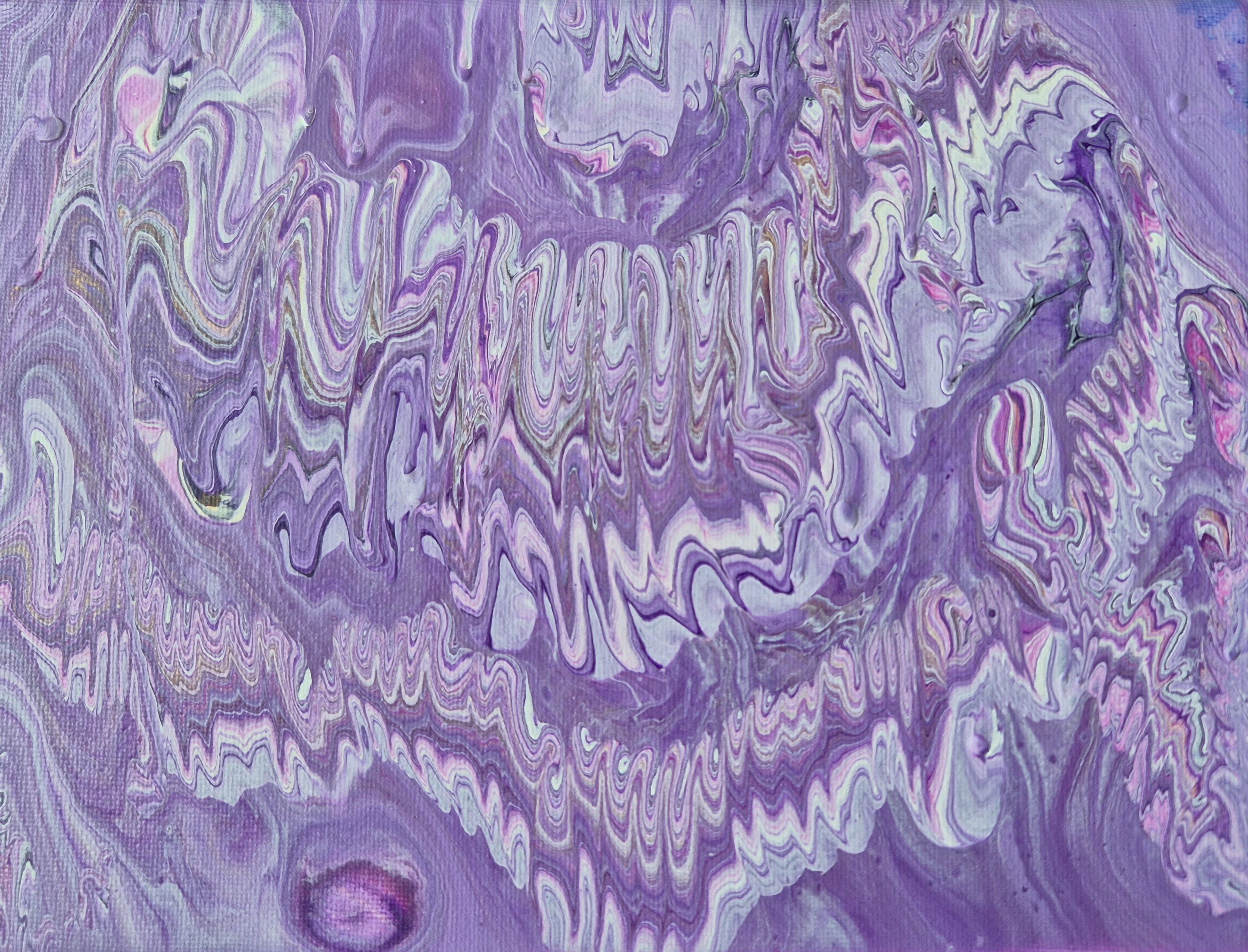 Das Bild ist im Open-Cup-Verfahren entstanden und ist ein abstraktes Kunstwerk. Die Farbpalette umfasst verschiedene Flieder- und Lilatöne, Magenta, Weiß.