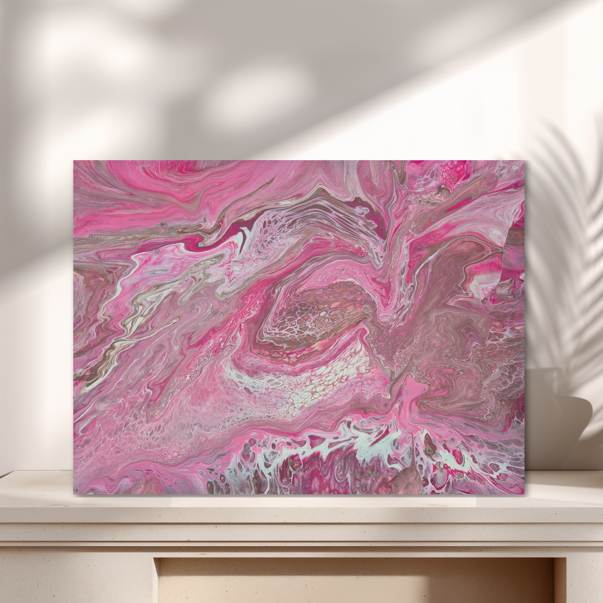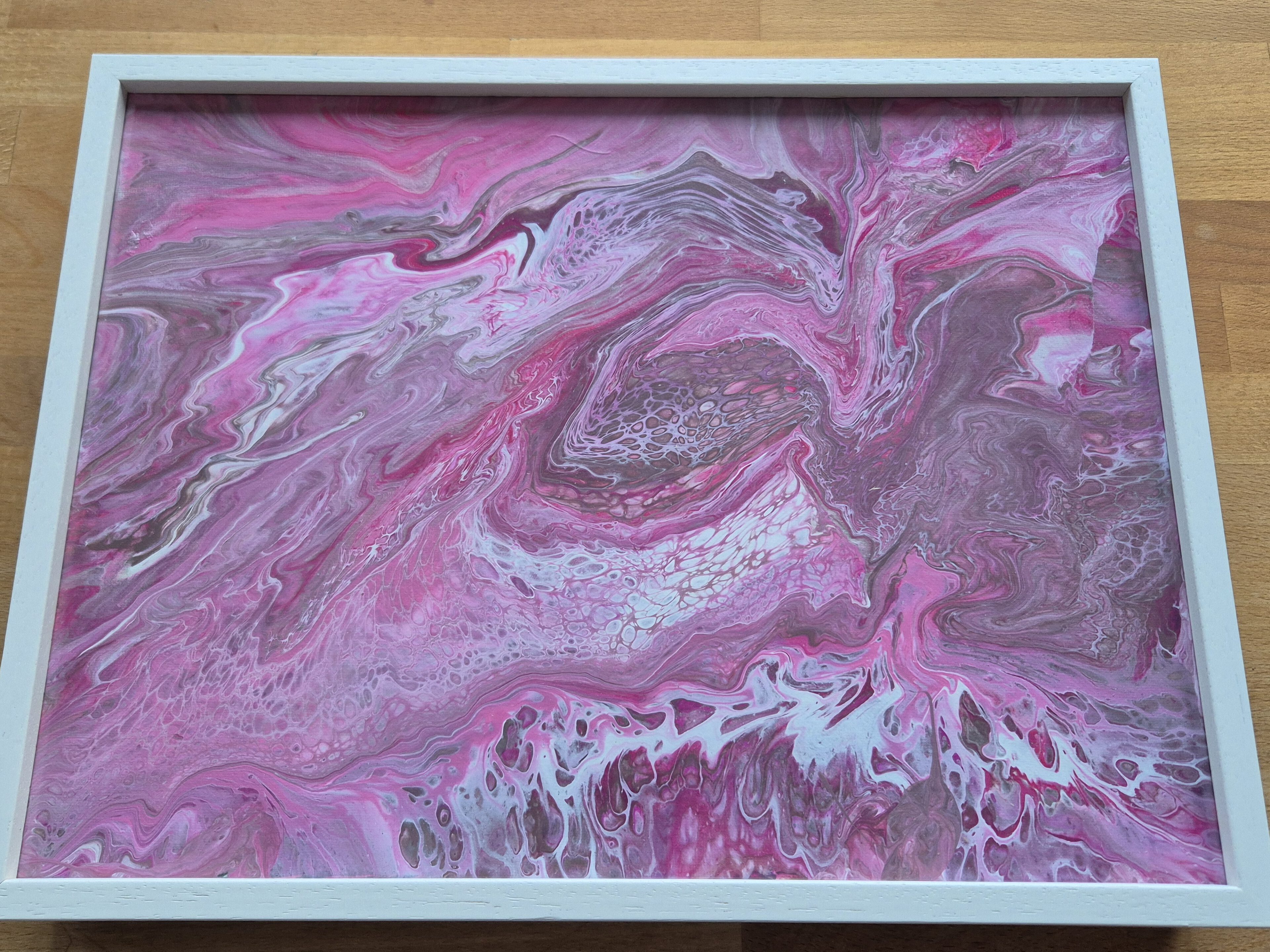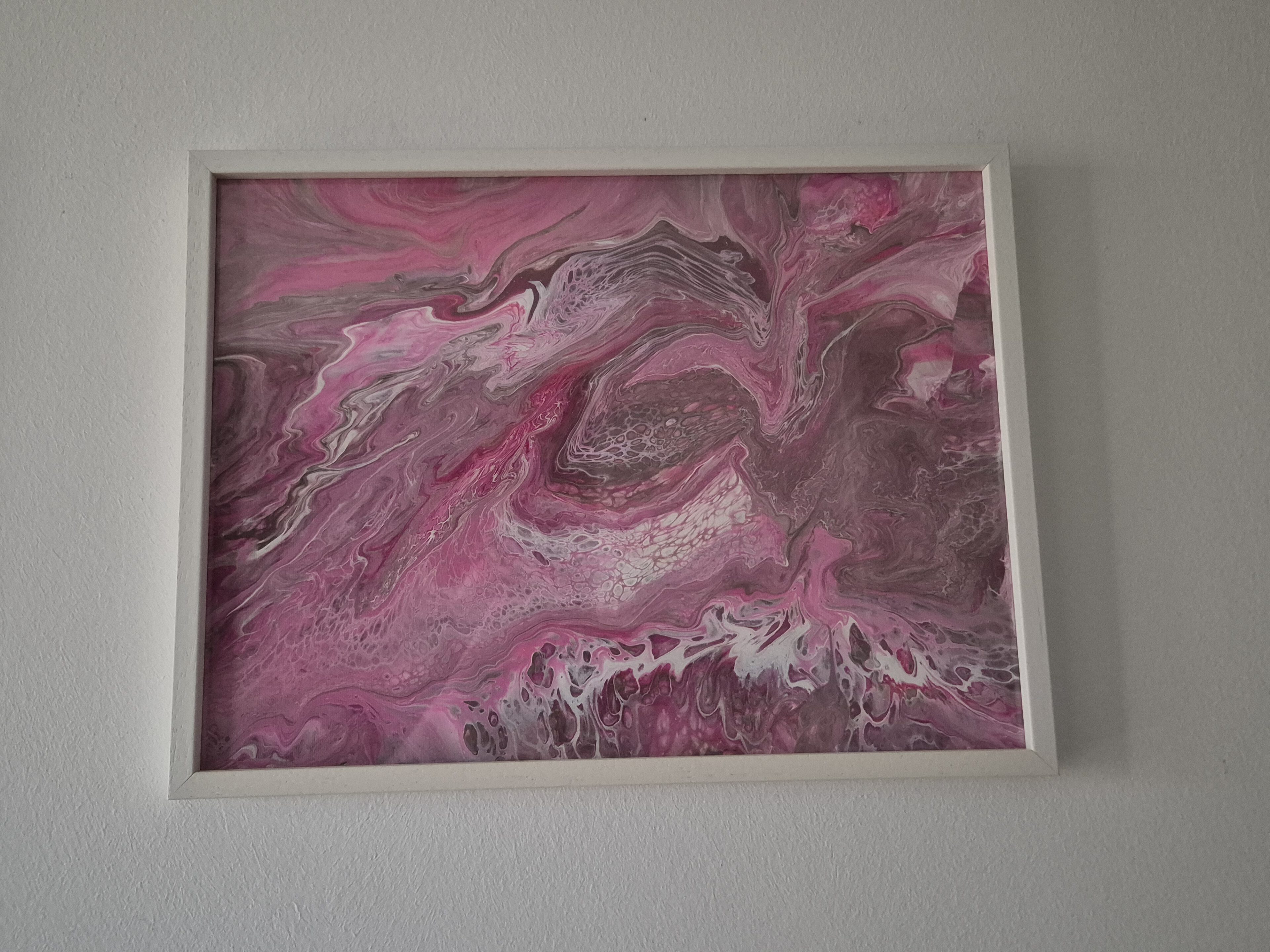 Wie bei Bild Nr. 1 der Trilogie kommen hier die Pastellfarben Pink, Cranberry, Silber und Cappuccinobraun vor – mit ganz anderem Ergebnis. Mit weißem Bilderrahmen.